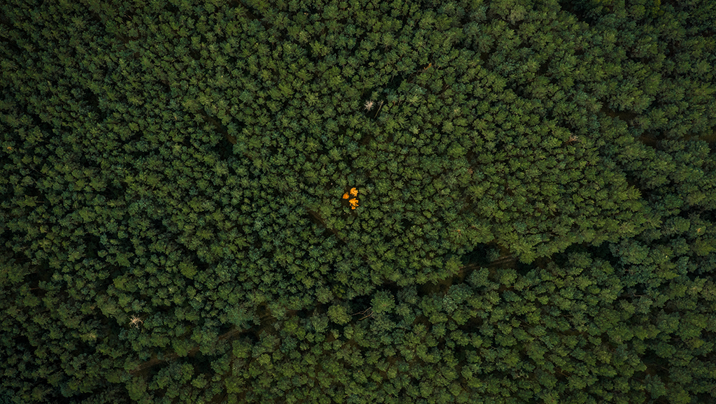 Ein Nadelwald mit ersten farblichen Akzenten aus der Perspektive unserer gefiederten Freunde. In/ oberhalb von Hohensaaten im Landkreis Märkisch-Oderland.