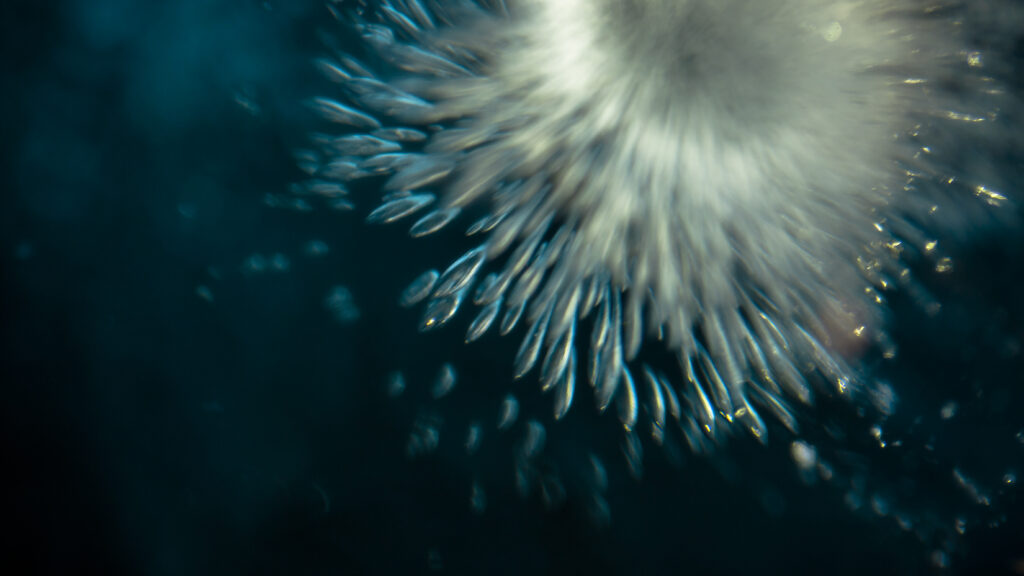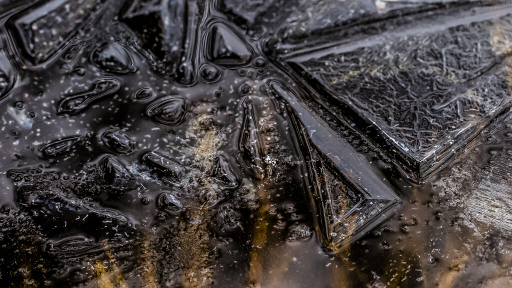 Gerade Linien, Muster und geometrische Figuren, gibt es auch in der Natur sehr wohl. Hier im Wasser als Eis. Der goldene Schimmer entstand durch die sich unter dem Eis befindliche Vegetation und das Lichtspiel. Passend zum Namen unseres Films.