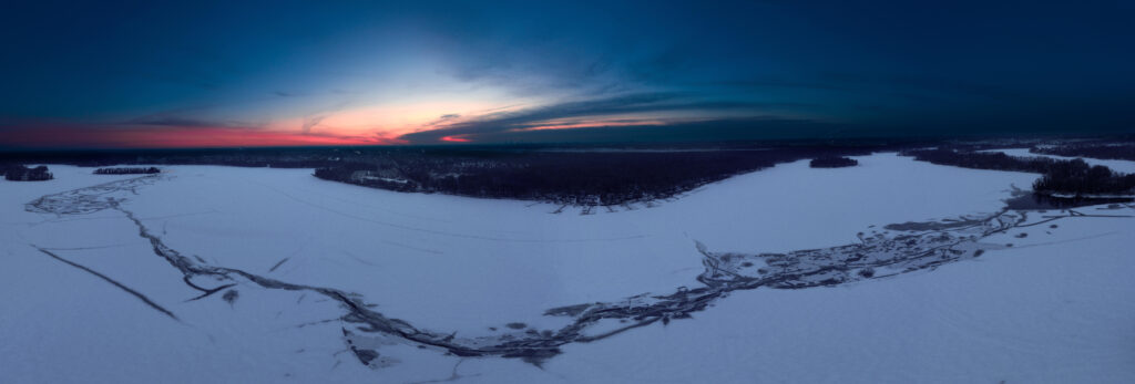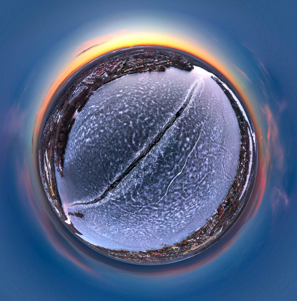 Die gefrorene Havel und der Niederneuendorfer See nahe Hennigsdorf und Heiligensee in Abendstimmung aus der Perspektive unserer gefiederten Freunde. Diese Ansicht kann kleine Welt genannt werden und ist Teil unserer zusätzlich bald folgenden virtuellen 360 Tour.