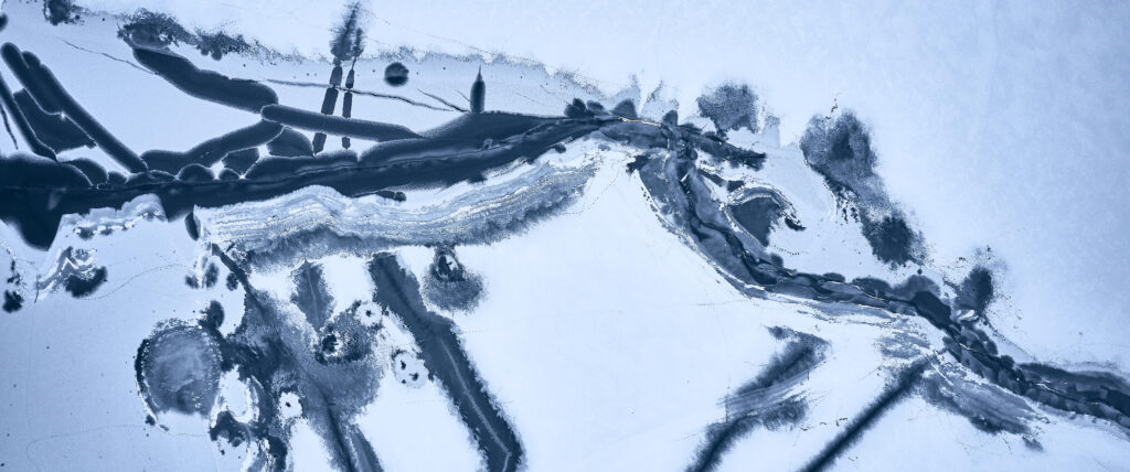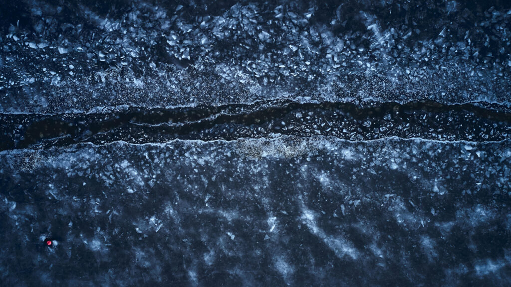 Die Havel in Eis, mit wenig Tageslicht und einer Boje, in 90 Grad-Draufsicht.